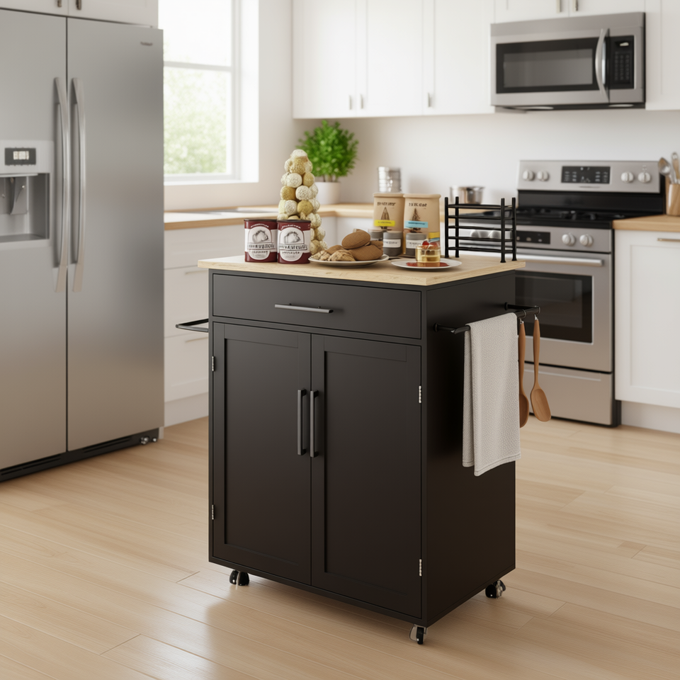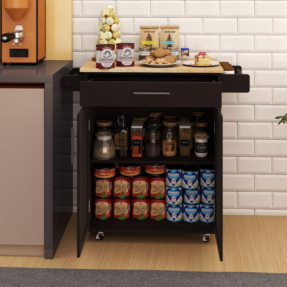Chariot de cuisine moderne DB Kitchen avec 1 tiroir, 2 portes, en bois, chariot de cuisine réglable pour îlot