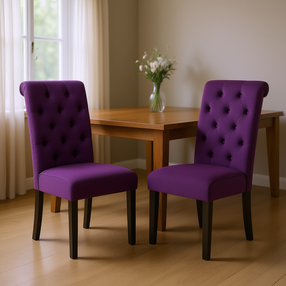 Ensemble de 2 chaises de salle à manger capitonnées DB Leviton, tissu violet, pieds en bois massif, design traditionnel et moderne