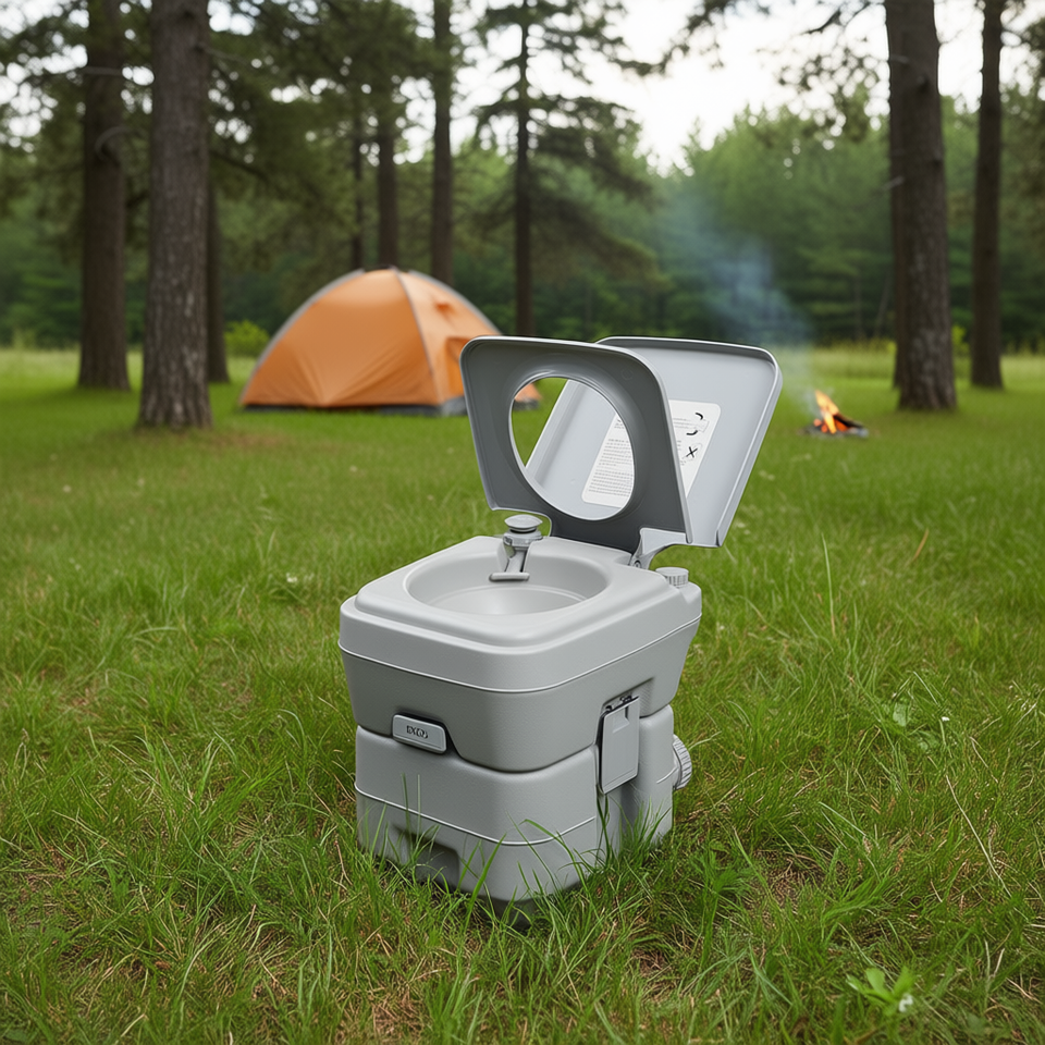 Toilette portable Db de 5 gallons avec chasse d'eau pour les voyages et le camping, utilisation en extérieur, design moderne gris