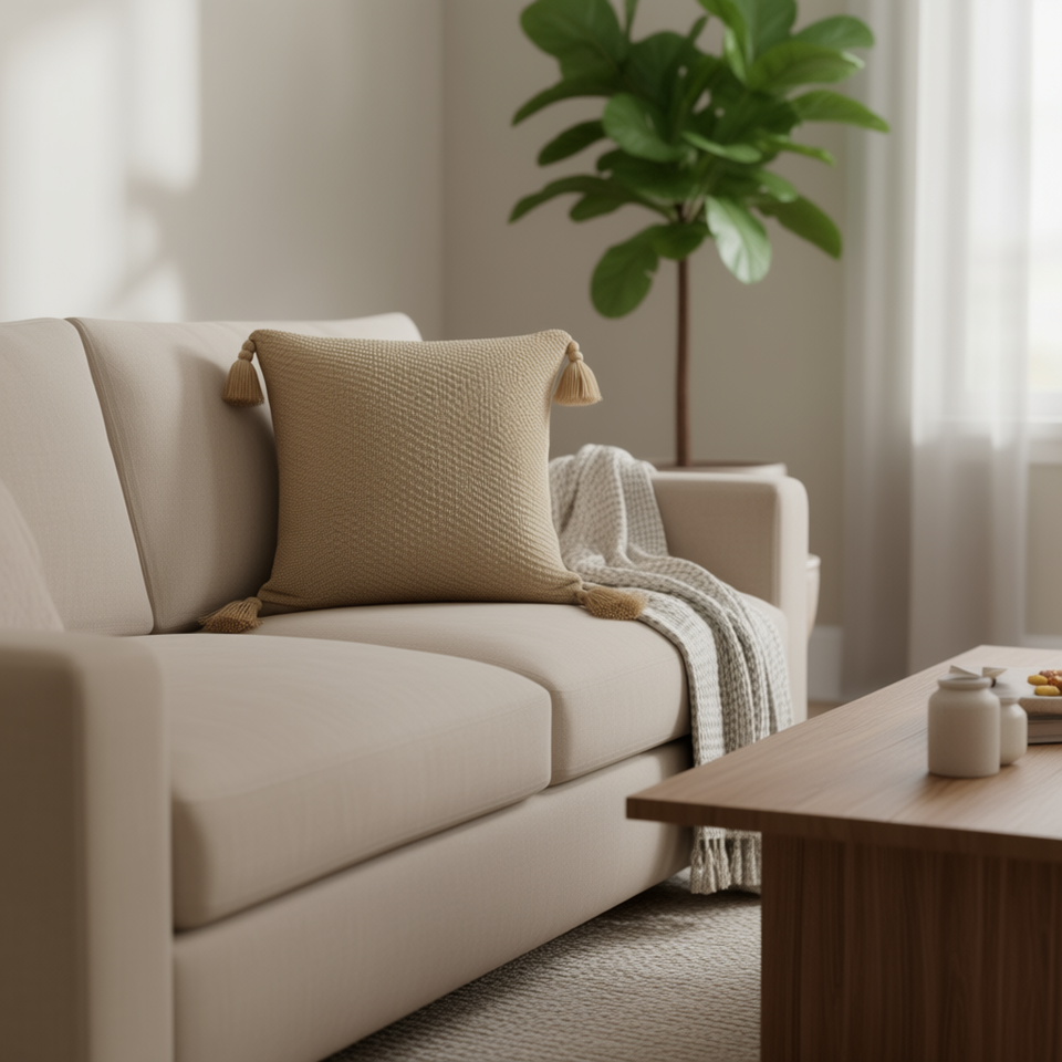 Housse de coussin géométrique DB 50 cm carrée, tricotée avec des accents de pompons, pour canapé de salon, couleur marron clair, style transitionnel