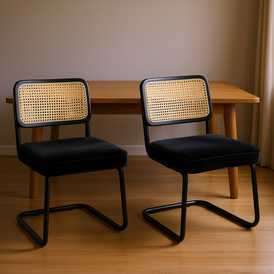 Ensemble de 2 chaises de salle à manger modernes du milieu du siècle, rembourrées en velours avec dossier en rotin, pieds en métal noir, design minimaliste