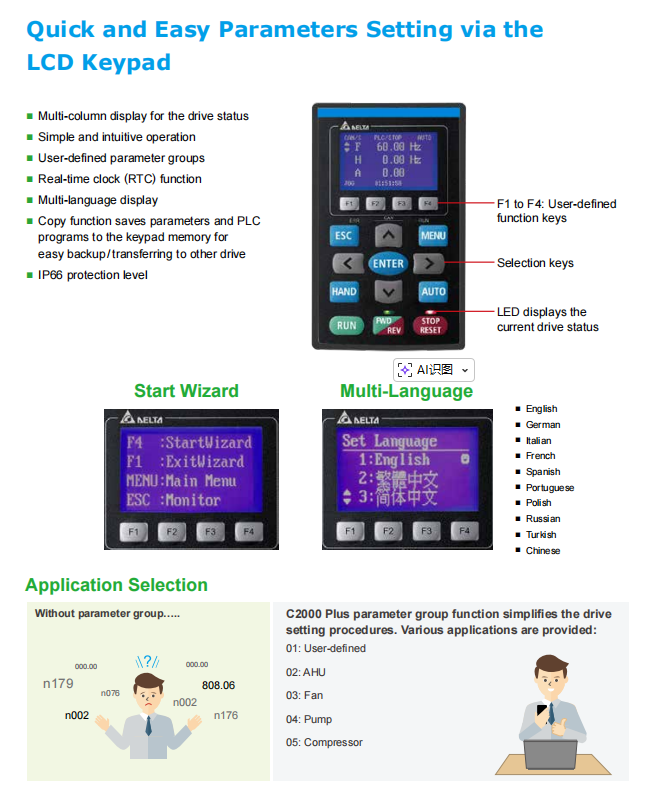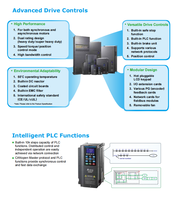 Variateur de fréquence DELTA VFD-CP2000 Série 5,5-75 kW pour ventilateur et pompe, tension nominale 380 V, triphasé, IP20, contrôle PLC, moteur