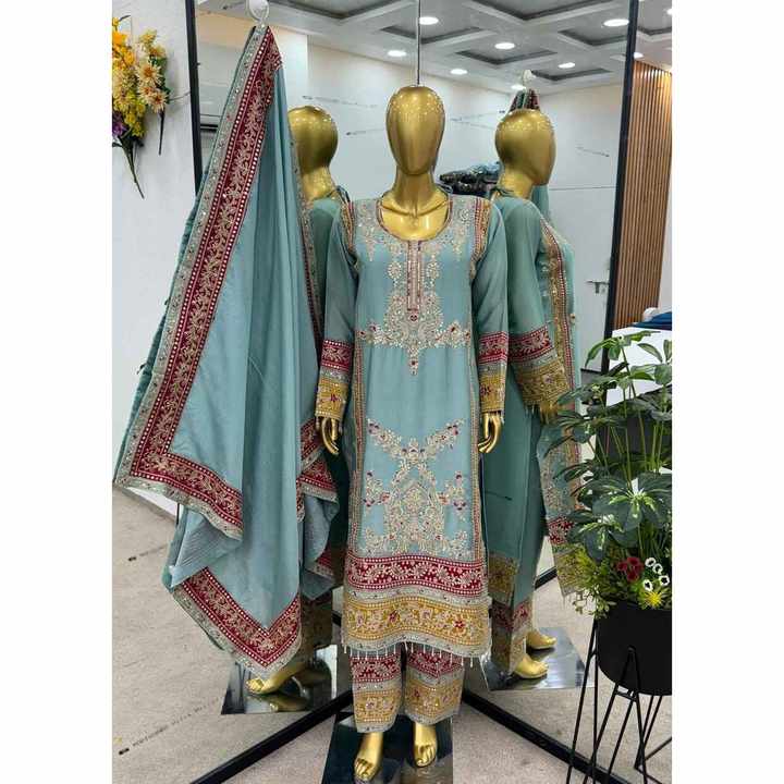 DESIGNER CHINON EMBROIDERY CODING SEQUENCE WORK TOP BOTTOM WITH DUPATTA SKY