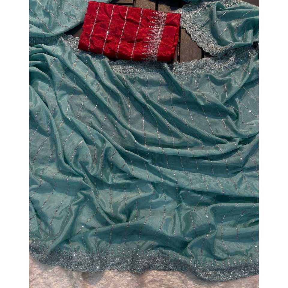 DESIGNER CHINON SILK EMBROIDERY SEQUENCE WORK SAREE WITH UNSTITCHED BLOUSE SKY