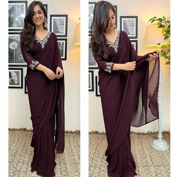 DESIGNER CRUSH GEORGETTE READY to WEAR SAREE WITH EMBROIDERY WORK STITCHED BLOUSE COFFEE