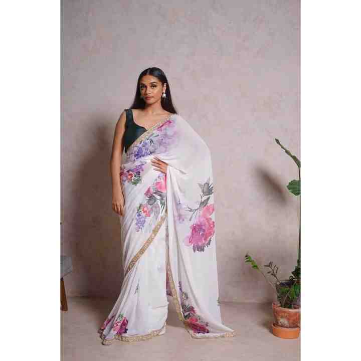 CRÉATEUR GEORGETTE IMPRESSION NUMÉRIQUE TRAVAIL SAREE AVEC BLOUSE NON COUCHÉE BLANC
