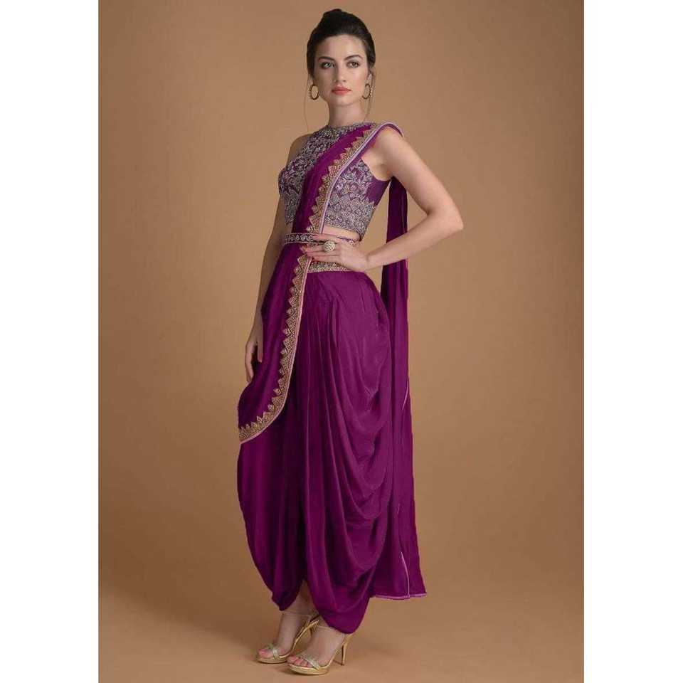 DESIGNER GEORGETTE EMBROIDERY SEQUENCE WORK READYMADE DHOTI UNSTITCHED BLOUSE WITH DUPATTA and BELT WINE
