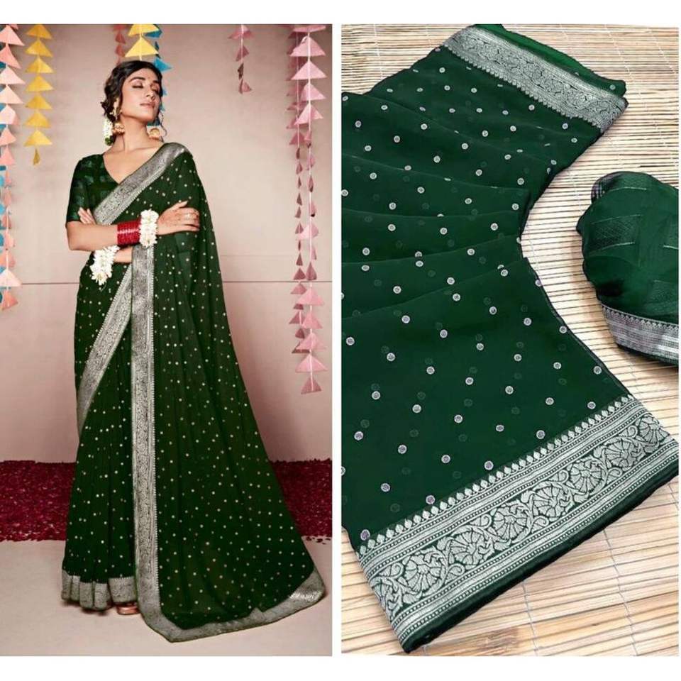 DESIGNER GEORGETTE FOIL and LACE BORDER WORK SAREE WITH UNSTITCHED BLOUSE GREEN