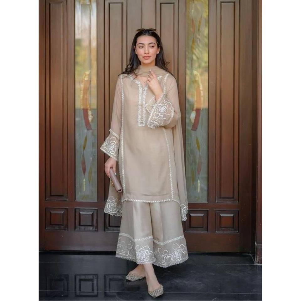 DESIGNER GEORGETTE GPO LACE TRAVAIL TOP PALAZZO AVEC DUPATTA