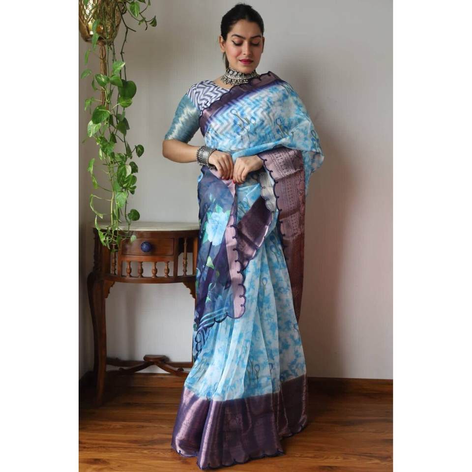 DESIGNER KANCHIPURAM ORGANZA SABURI IMPRESSION NUMÉRIQUE AVEC ARCO CUT TRAVAIL SAREE AVEC BLOUSE NON COUDU SKY