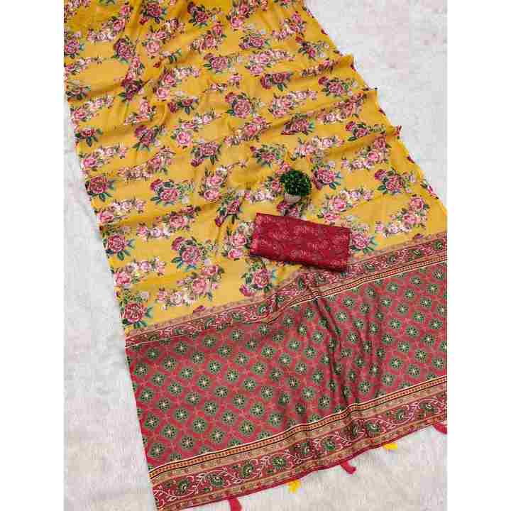 SIGNER LIN IMPRESSION NUMÉRIQUE TRAVAIL SAREE AVEC CHEMISIER NON COUDU JAUNE