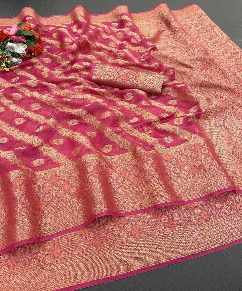 DESIGNER ORGANZA DESIGNER BORDER WORK SAREE WITH UNSTITCHED BLOUSE PARTY WEAR WHOLESALE PRICE ETHNIC GARMENT PINK