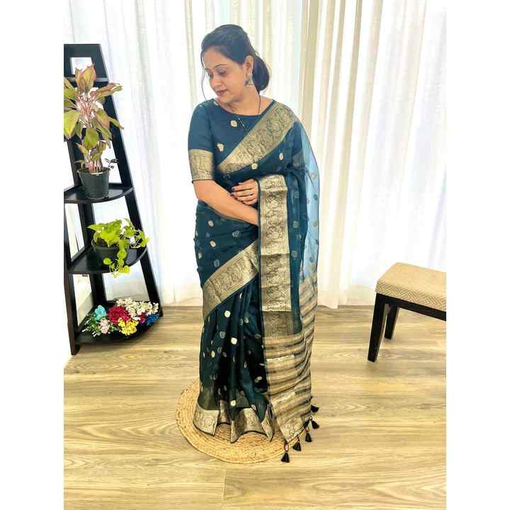 DESIGNER ORGANZA SOIE OR ZARI TRAVAIL SAREE AVEC BLOUSE INCOSÉE BLEU
