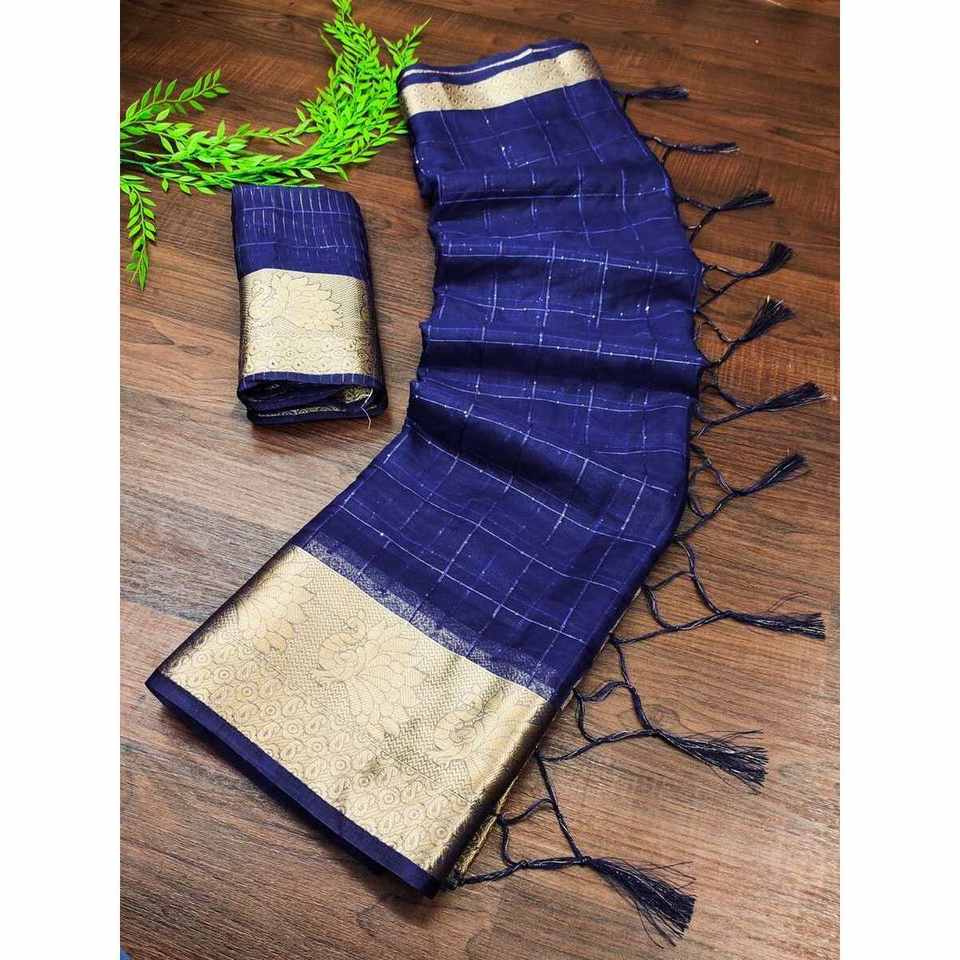 DESIGNER ORGANZA SILK JACQUARD WEAVING SEQUENCE WORK SAREE WITH UNSTITCHED BLOUSE NAVY BLUE