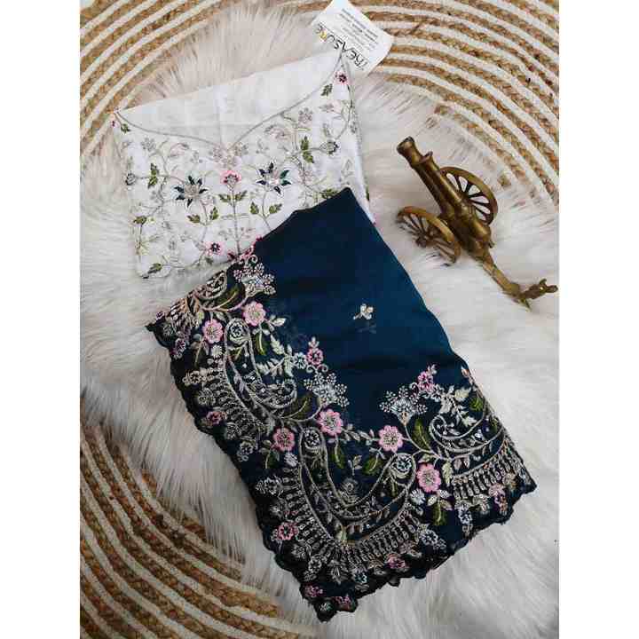 DESIGNER RANGOLI FIL DE SOIE BRODERIE SEQUENCE TRAVAIL SAREE avec CHEMISIER NON COUDU BLEU MARINE