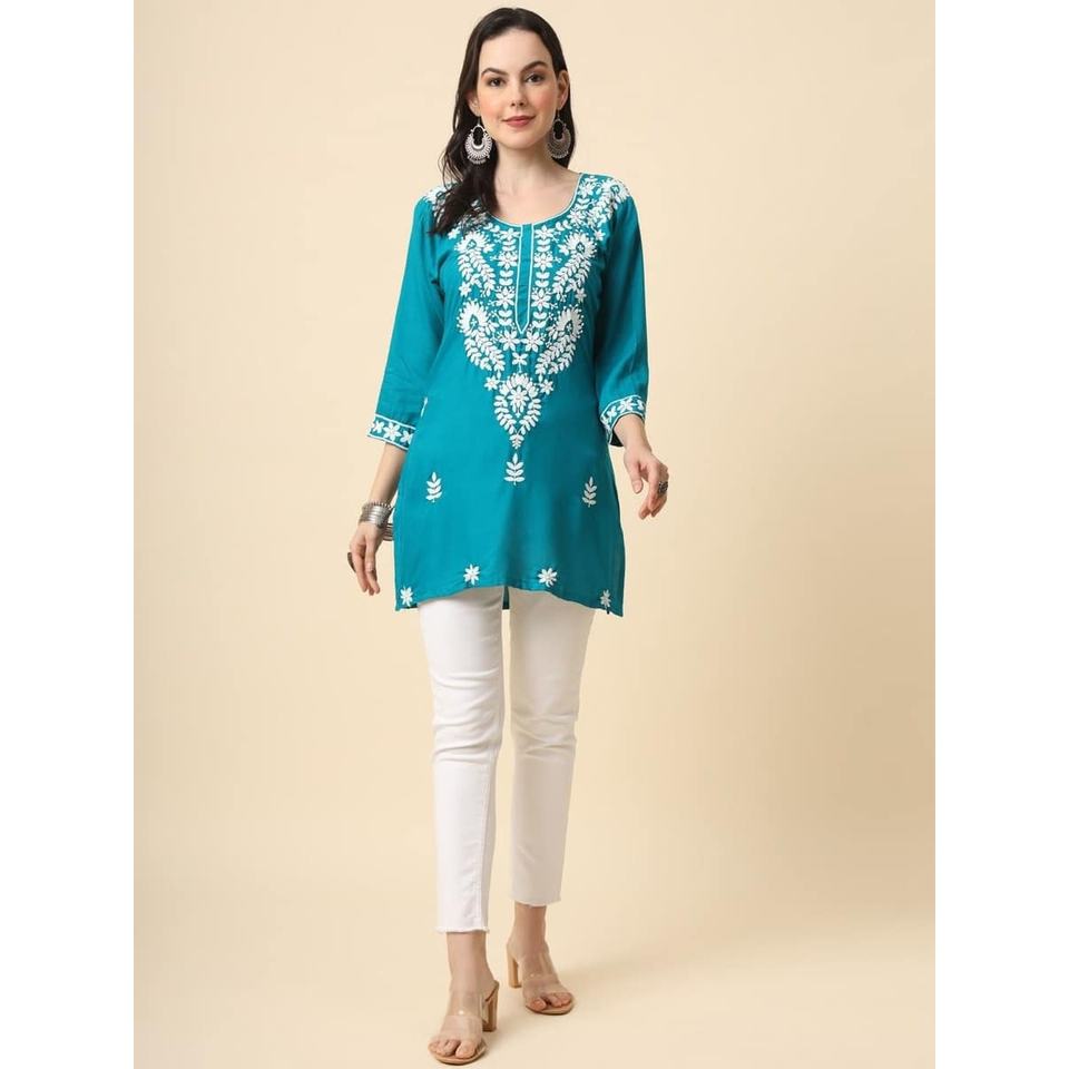 DESIGNER RAYON CHICKENKARI WORK ONLY KURTI SKY