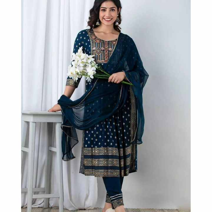 DESIGNER RAYON OR IMPRIMÉ TRAVAIL HAUT BAS AVEC DUPATTA BLEU MARINE