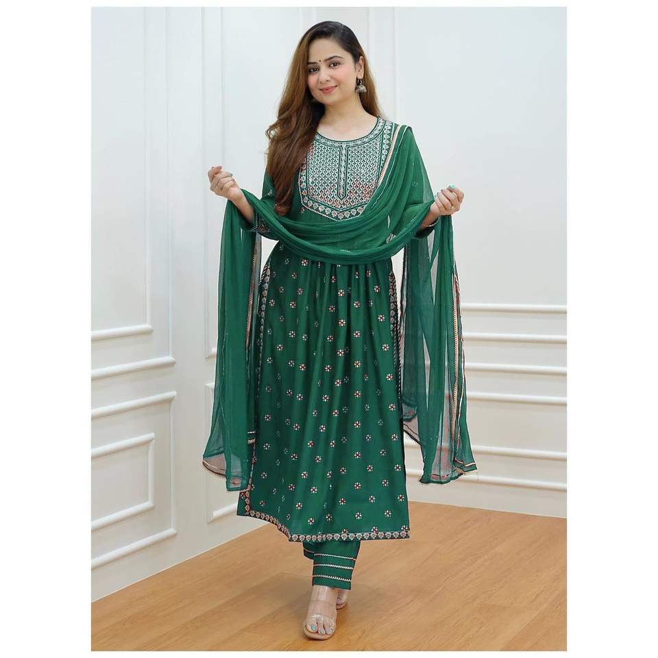 DESIGNER RAYON NAIRA EMBROIDERY WORK TOP and BOTTOM SET with DUPATTA in GREEN