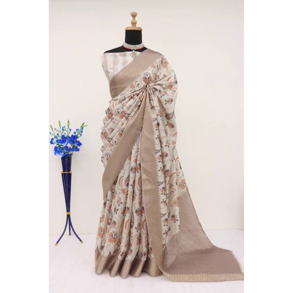 DESIGNER SILK FLORAL and DIGITAL PRINT WORK SAREE WITH UNSTITCHED BLOUSE WHITE