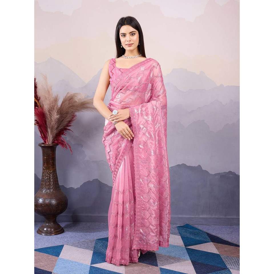 CRÉATEUR DOUX FILET SALI BRODERIE TRAVAIL À LA MAIN AVEC SEQUENCE TRAVAIL SAREE AVEC CHEMISIER NON COUDU ROSE