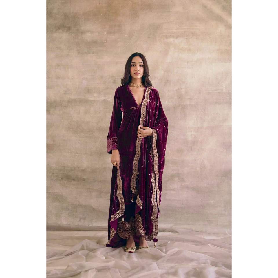 Designer Velvet Embroidery Work Gown Bottom with Dupatta in Wine Color