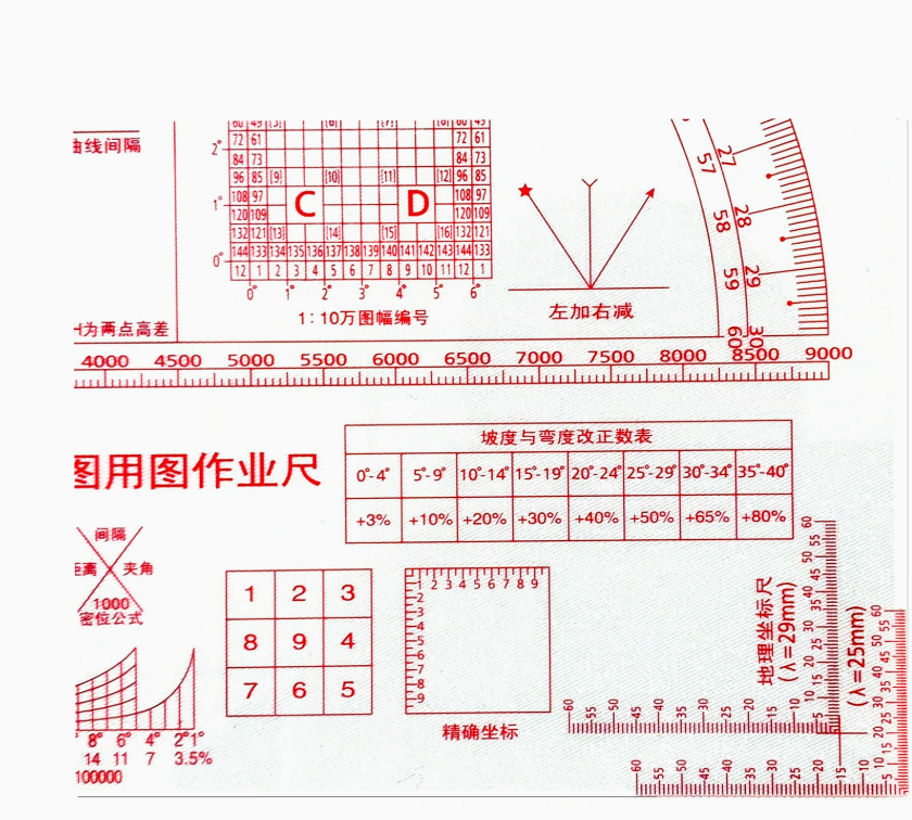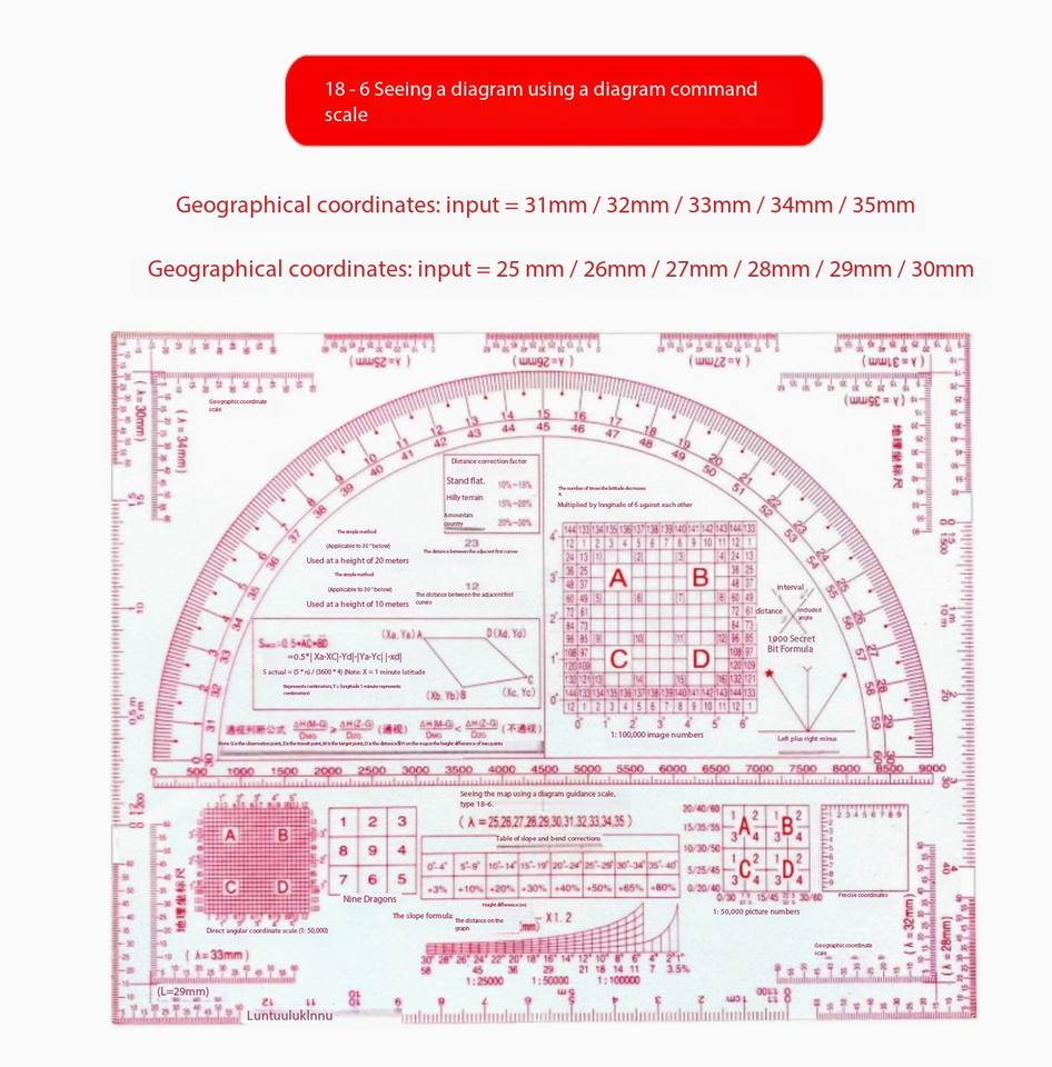Règle de reconnaissance graphique et de commande multifonctionnelle bicolore DF 81, avec une échelle de coordonnées géographiques de 1:50 000