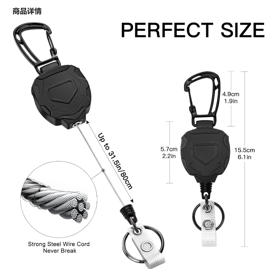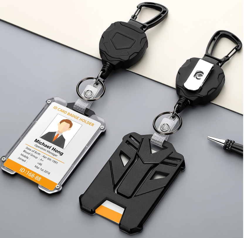 DFR01 Porte-badge rétractable en plastique noir avec logo personnalisé, porte-clés avec clip arrière en métal