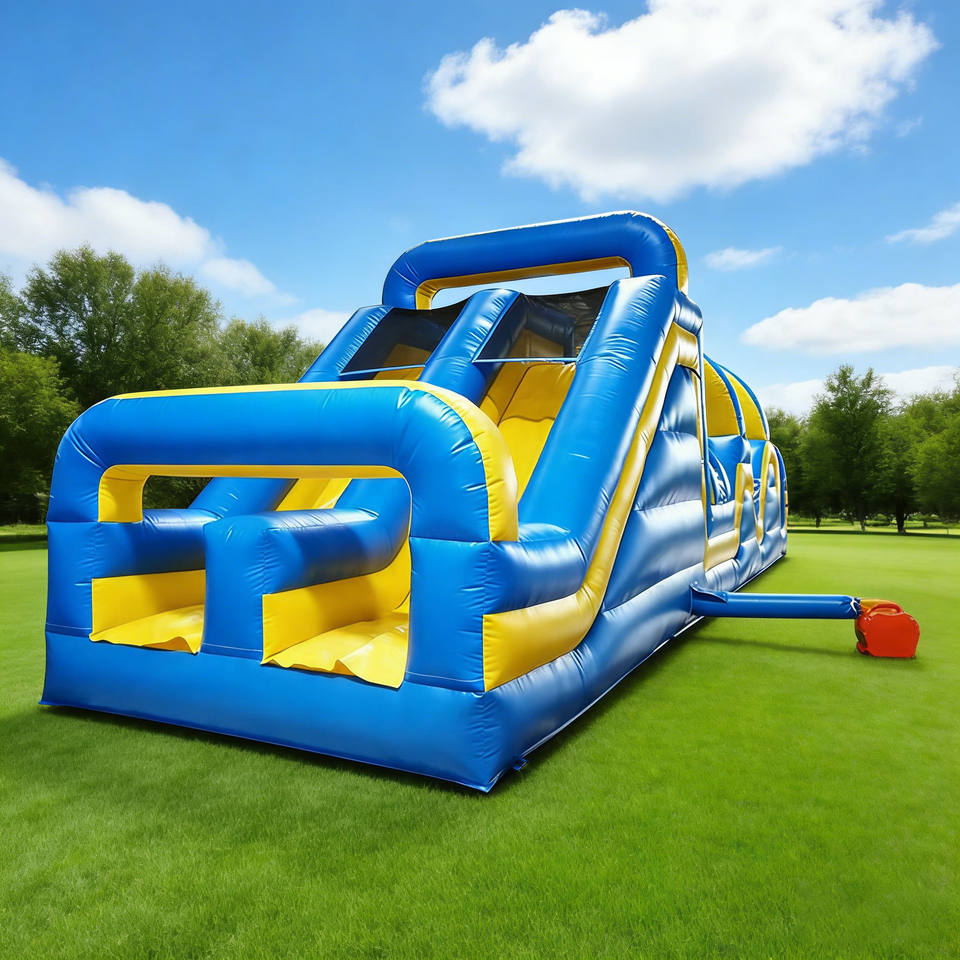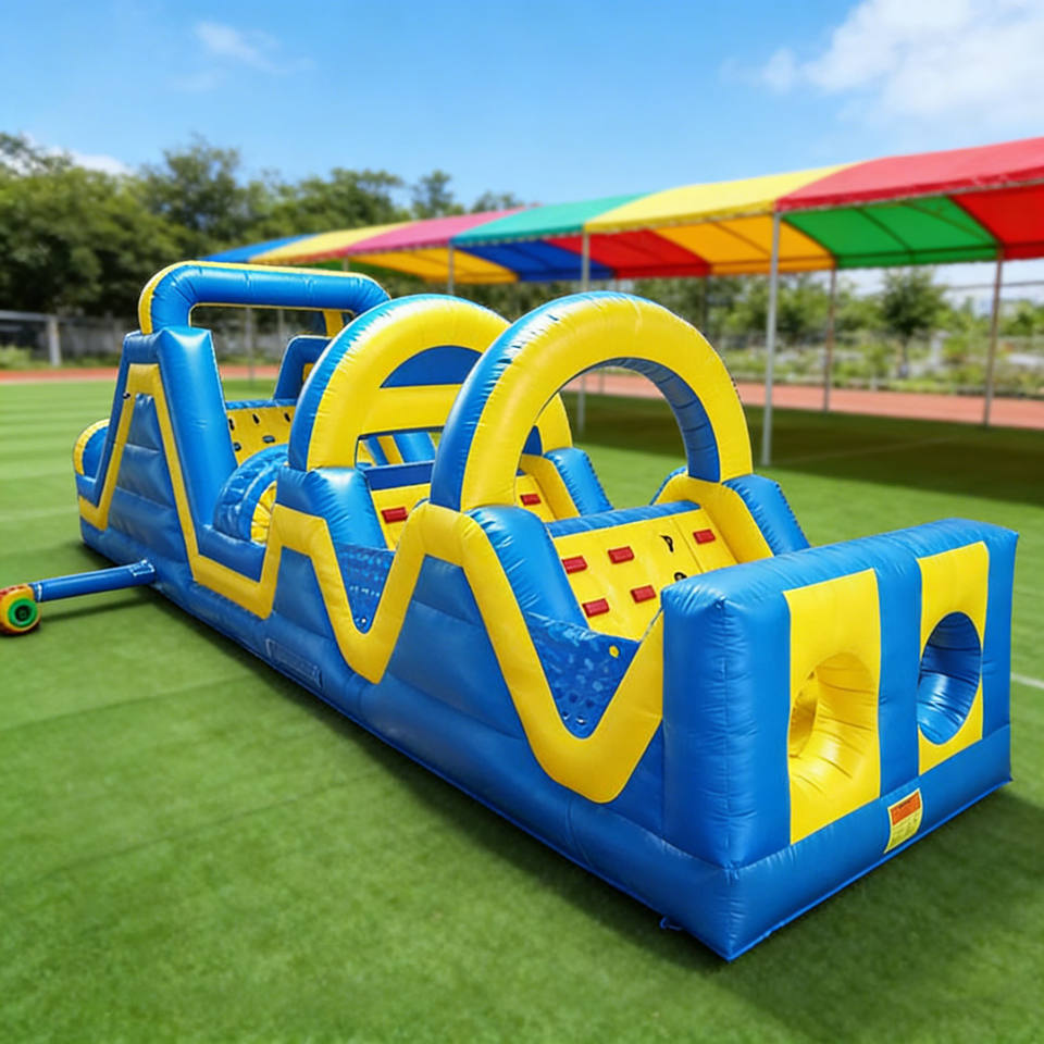 Parcours d'obstacles gonflable pour enfants DFRL, taille personnalisée, qualité commerciale, PVC 0,55 mm, 32 pieds, jaune et bleu, garantie 3 ans