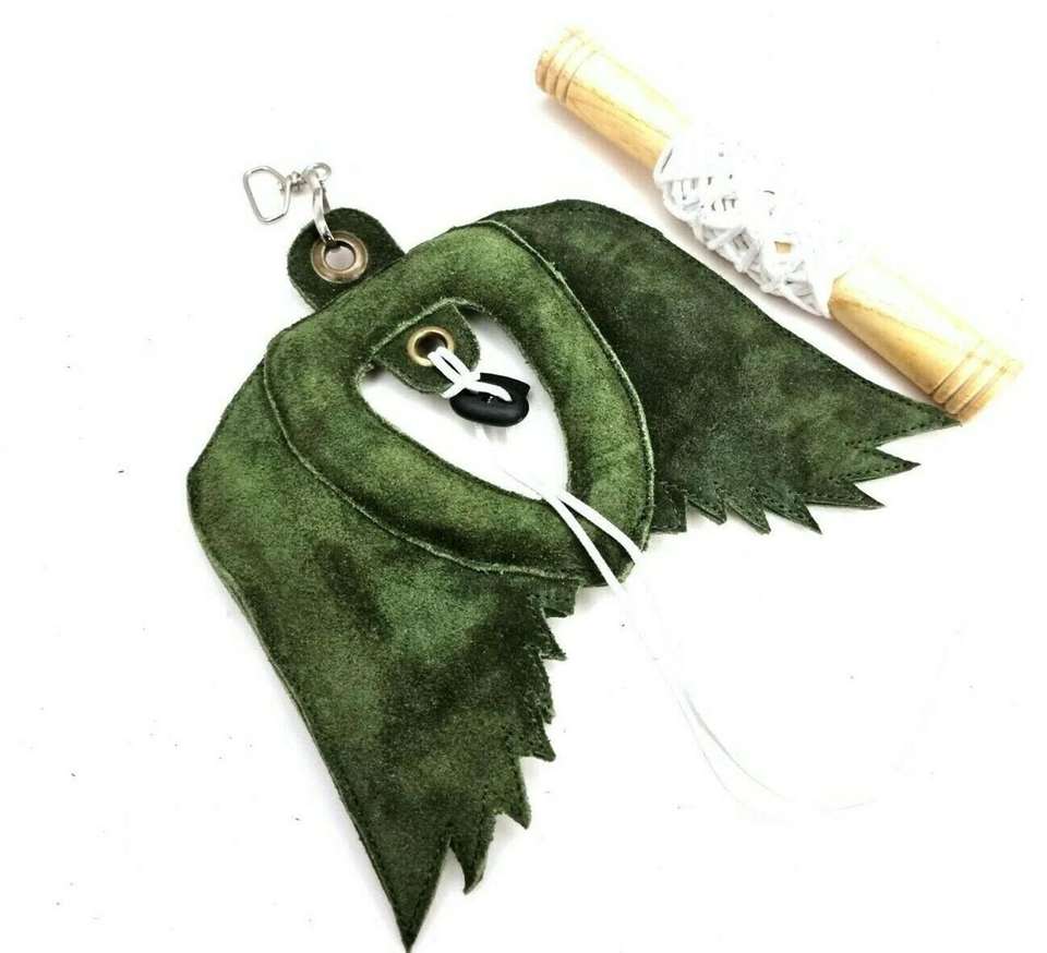 Découvrez le leurre de fauconnerie en cuir suédé vert IMPEX pour kit d'entraînement des faucons, des hiboux et des oiseaux de proie, avec corde et motif camouflage