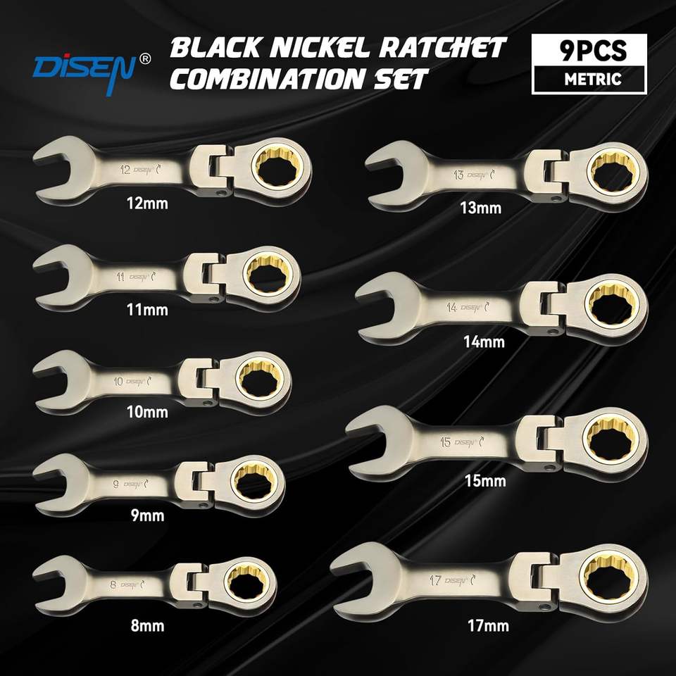 DISEN Jeu de 9 clés à cliquet trapues à tête flexible 8-17mm métrique CRV nickelage combinaison pochette roulante