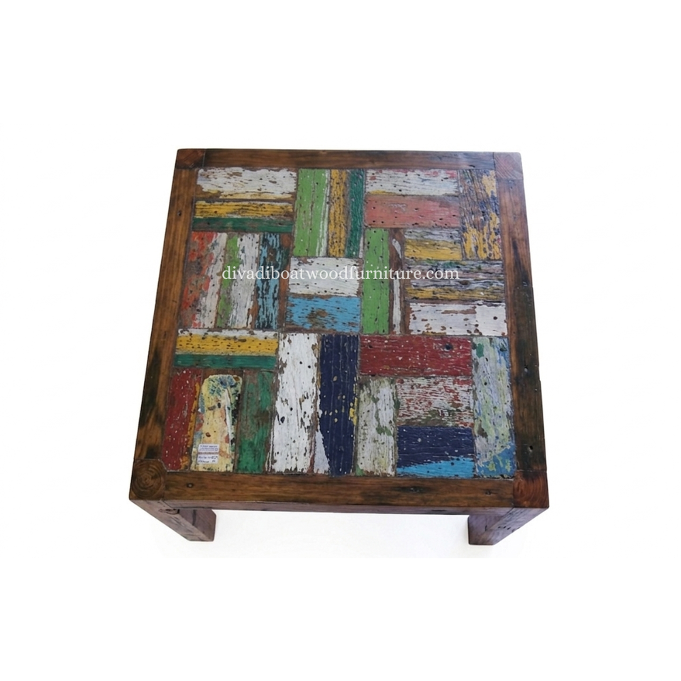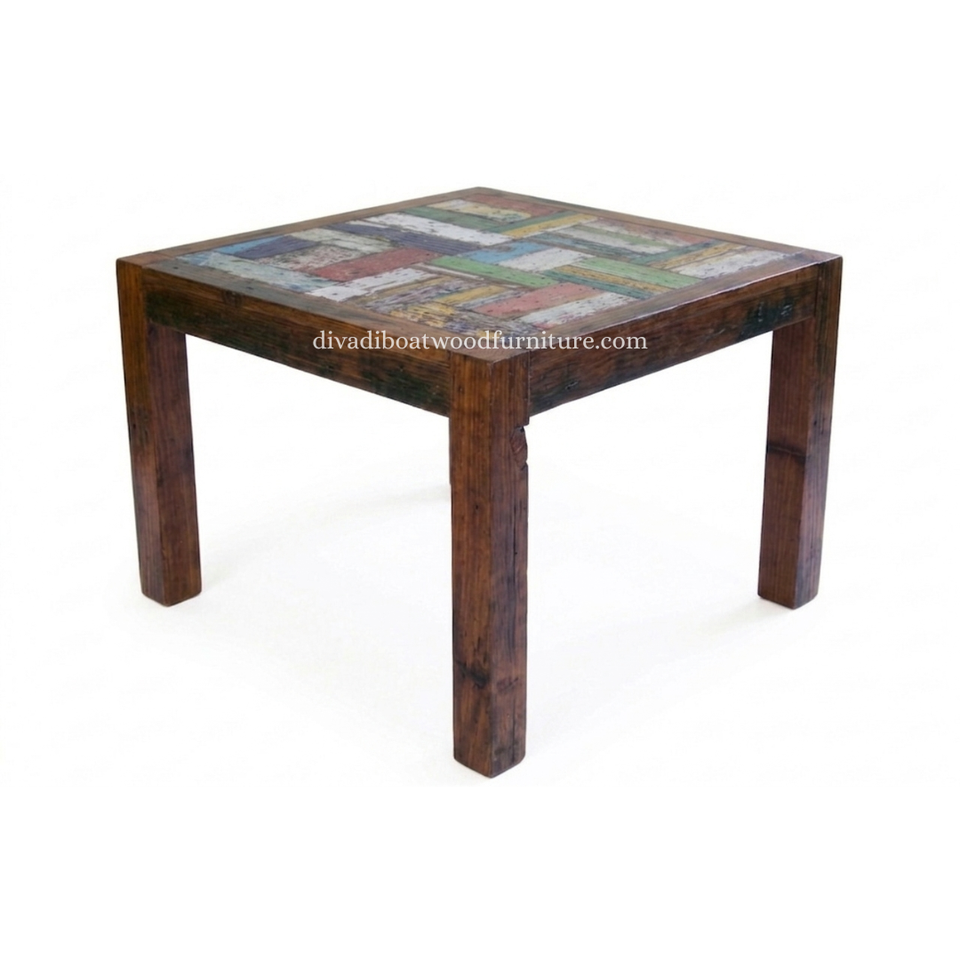 Table à manger DIVADI, modèle carré à pieds fixes, patchwork, bois de bateau recyclé, design durable, écologique, pour intérieur et extérieur