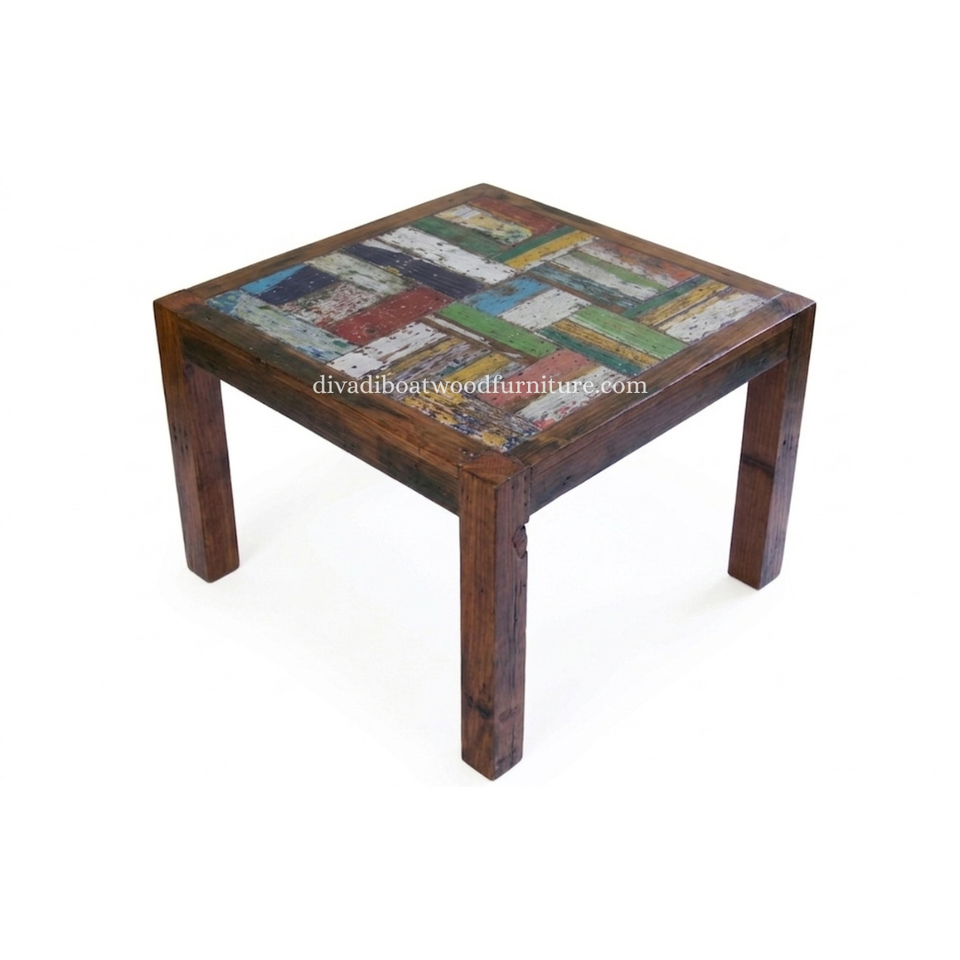 Table à manger DIVADI, modèle carré à pieds fixes, patchwork, bois de bateau recyclé, design durable, écologique, pour intérieur et extérieur