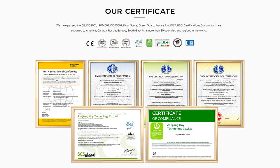 Certificat:Floorscore, ISO9001, ISO14001, garde verte, CE
