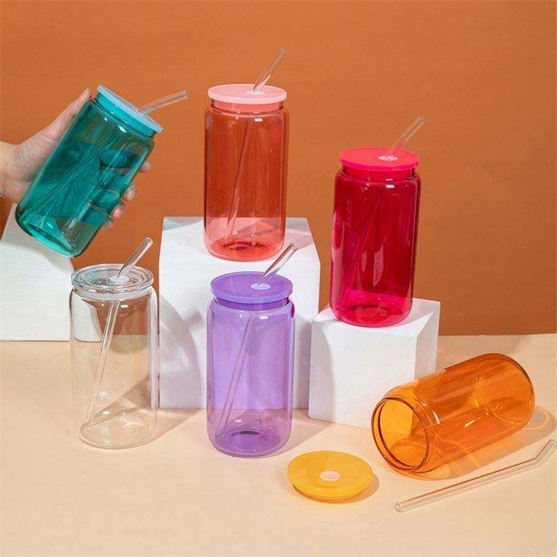DIY Heat Press 16Oz White Shimmer Mason Jar Soda Beer Can Shaped Glitter Libby Plastic Cup With Bamboo Lid and Straw
