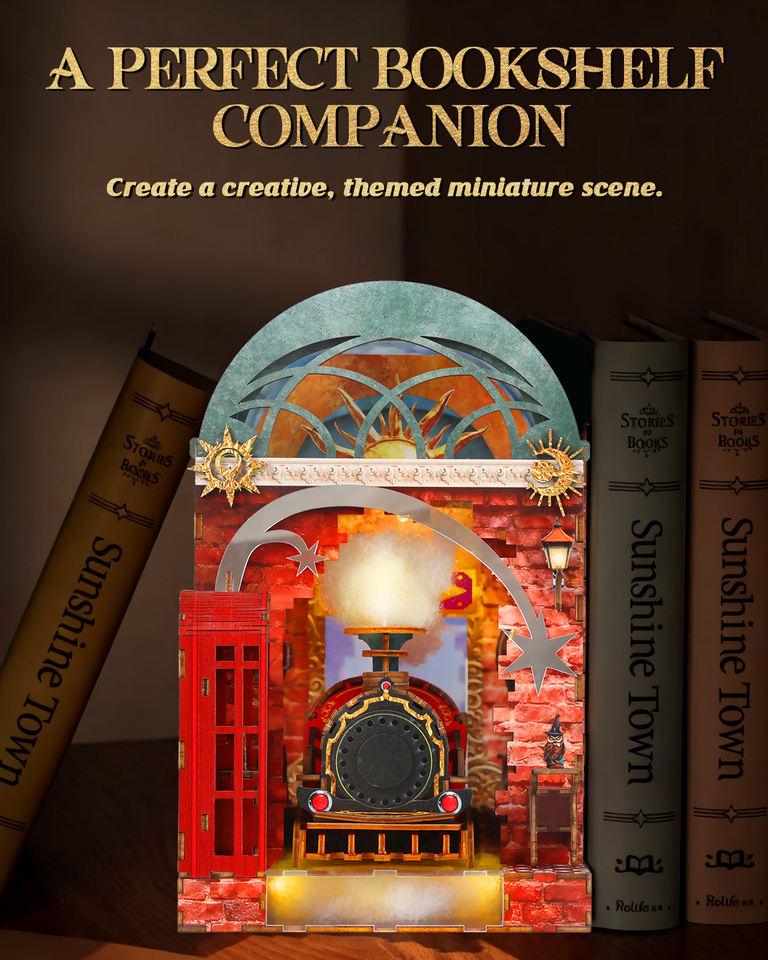 Kit DIY de train miniature pour bibliothèque - Puzzle en bois 3D avec lumière LED, décoration rétro steampunk pour étagère, pour adultes et adolescents (183 pièces)