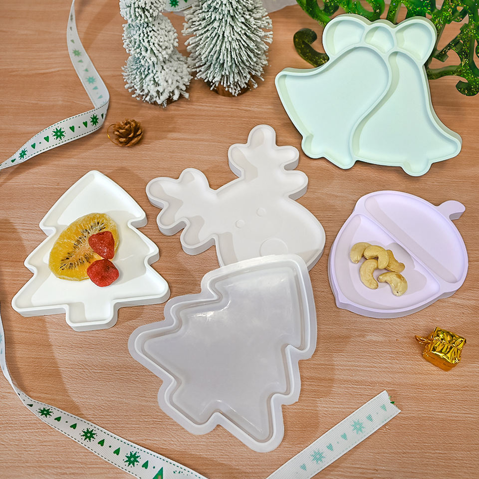 DM1023 Moules en résine DIY pour assiette de Noël, moule en silicone pour assiette de rangement en plâtre, motif élan, clochette et plateau à fruits, pour la décoration intérieure