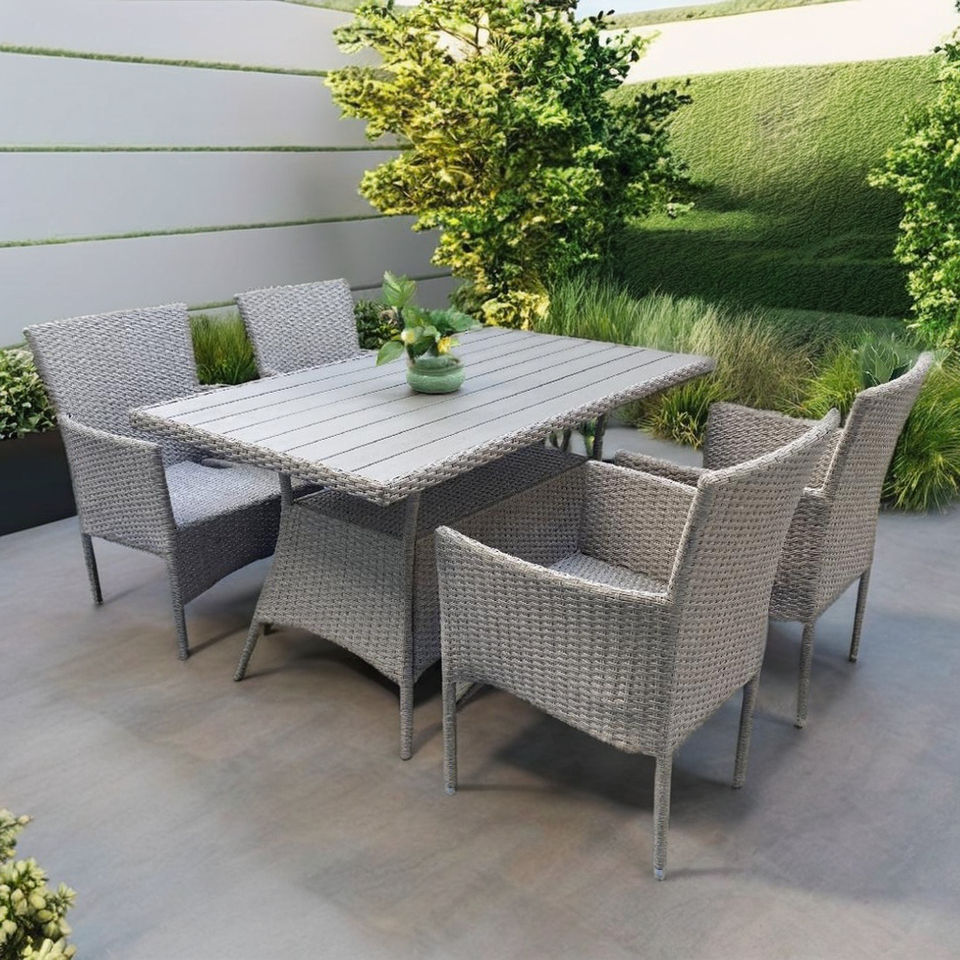 Ensemble de meubles de jardin d'extérieur de style moderne en rotin et acier avec table en verre trempé, 1 table et 4 chaises empilables