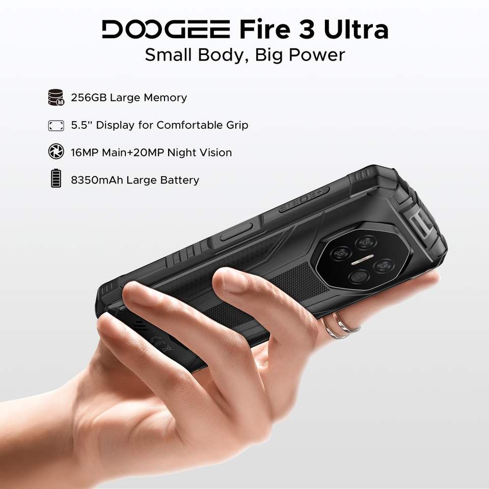 DOOGEE Fire3 Ultra Téléphone Robuste Android 15 Octa Core 5,5 Pouces HD+ 6 Go RAM 8350 mAh NFC Antichoc IP68 LTE Charge Rapide 60W GPS