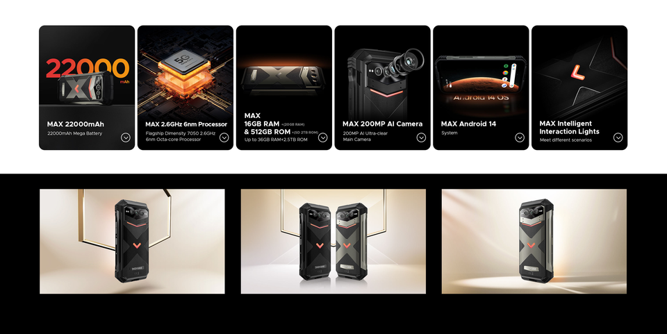 DOOGEE V Max Plus 6,58 pouces Android 14 OTG NFC Smartphone robuste 5G étanche IP68 GSM Cellulaire 16 Go + 512 Go Octa Core 120 Hz LED