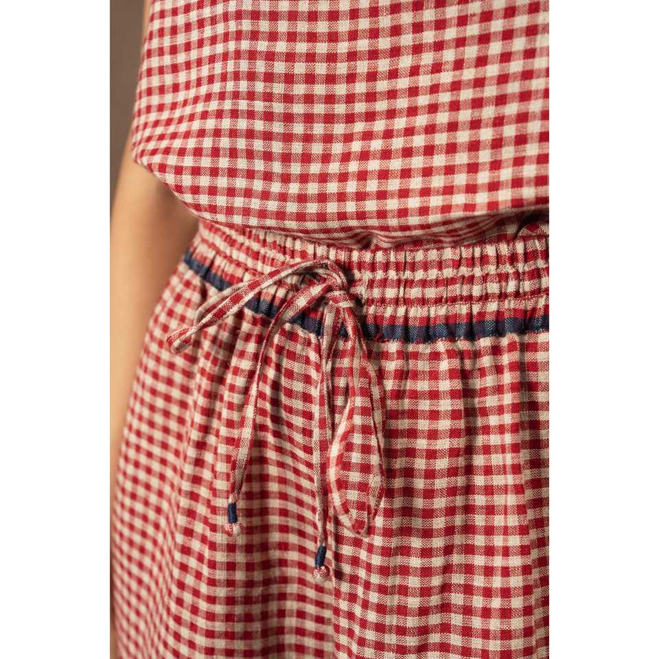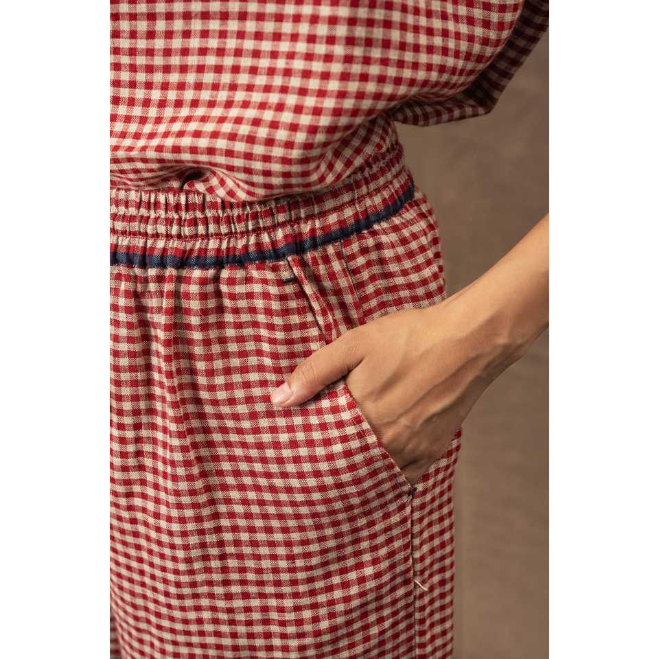 DVE DITYAA Pantalon en lin tissé à la main, taille haute, coupe large, respirant, technique froissée, motif à carreaux cramoisie, pour l'été, pour filles, 3XL
