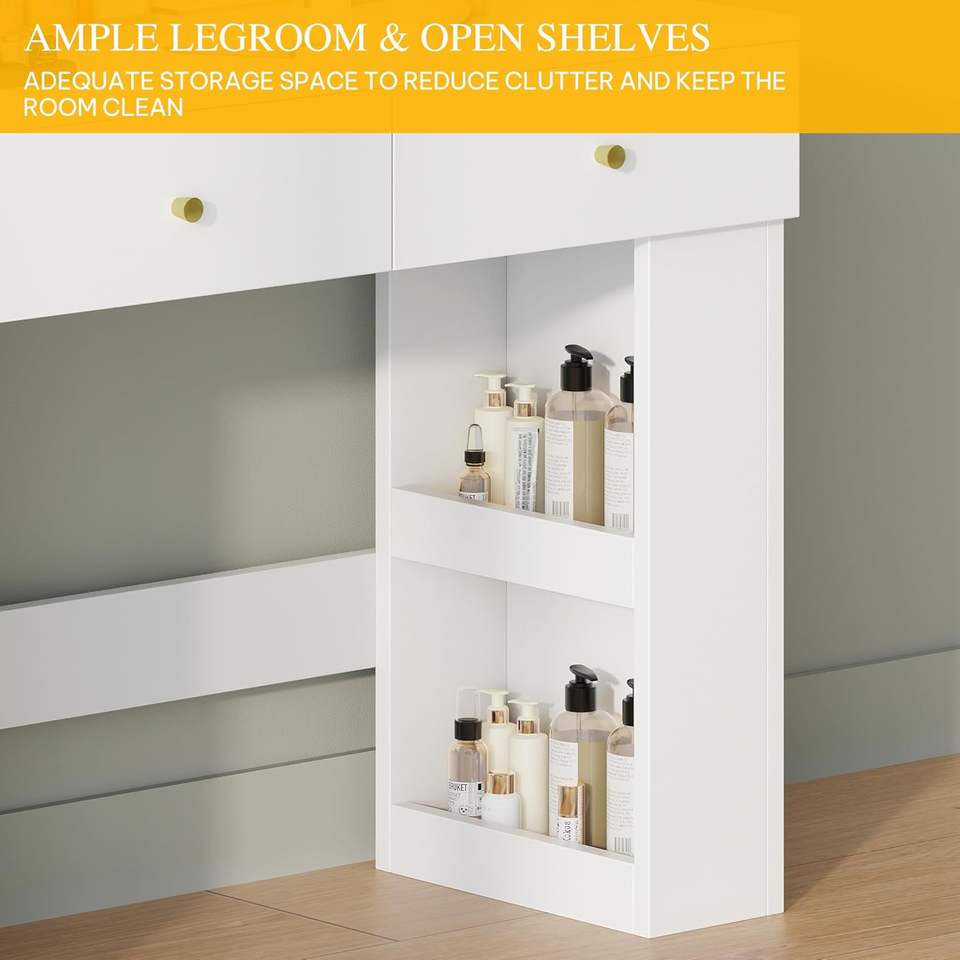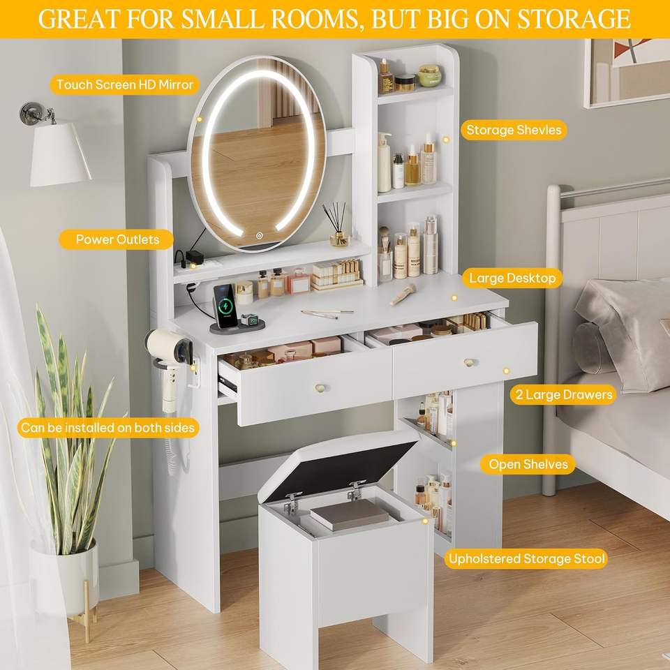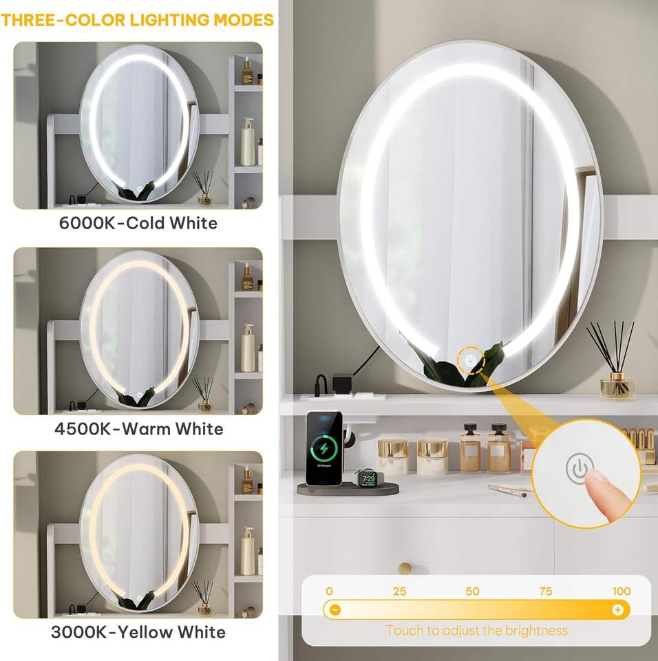DWVO Ensemble table de maquillage avec miroir et éclairage 3 couleurs Prise de courant Chaise 3 tiroirs pour rangement Table de toilette blanche Lots