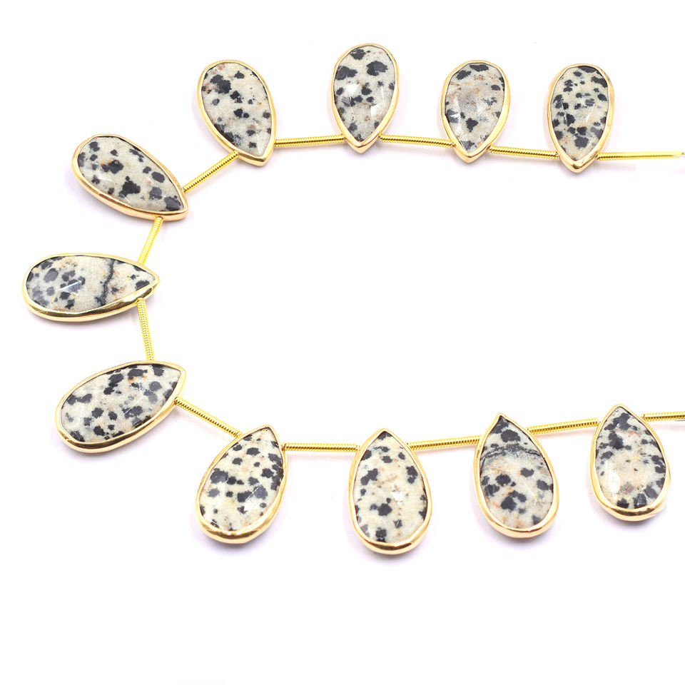 Jaspe dalmatien en forme de poire, serti en argent, 21 à 23 mm, plaqué or, côté supérieur percé, 11 perles par brin