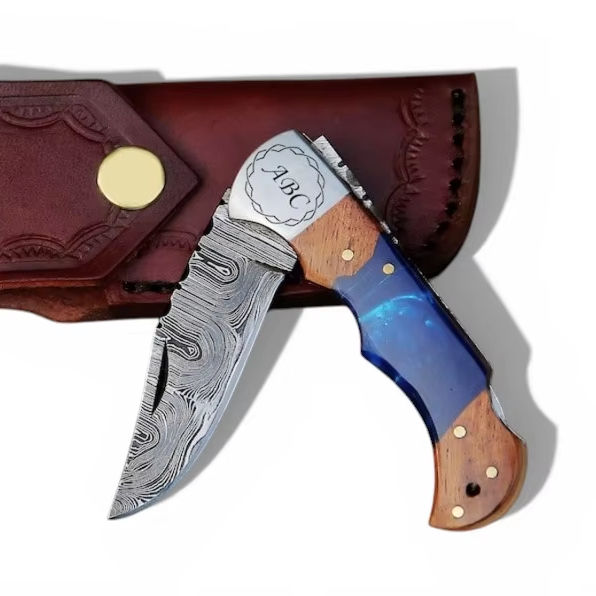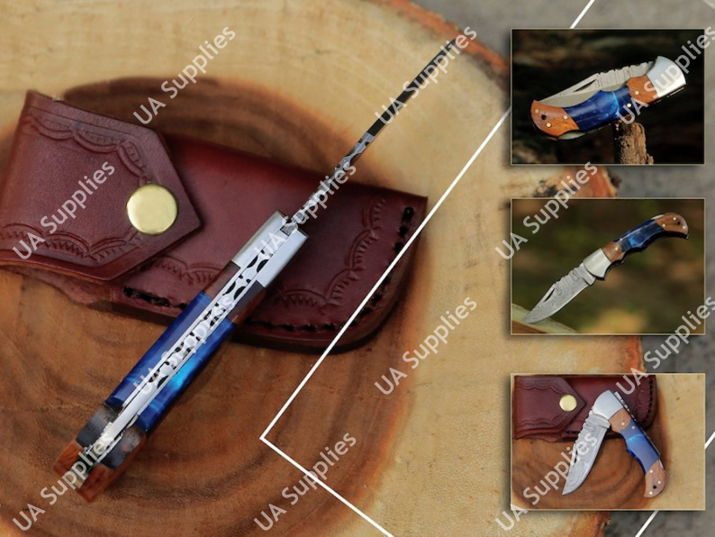 Couteau de poche pliant utilitaire en acier Damas avec verrouillage arrière, manche en bois et époxy, pointe tombante 3,5 pouces, 58-60 HRC, léger et durable