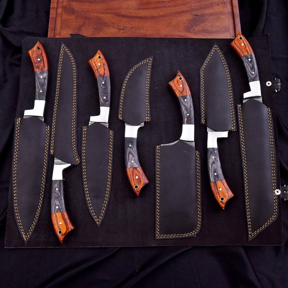 Ensemble de couteaux de chef en acier Damas avec manche en bois Pakka, sept pièces, forgés sur mesure, faits à la main, OEM, couteaux de cuisine professionnels avec sac