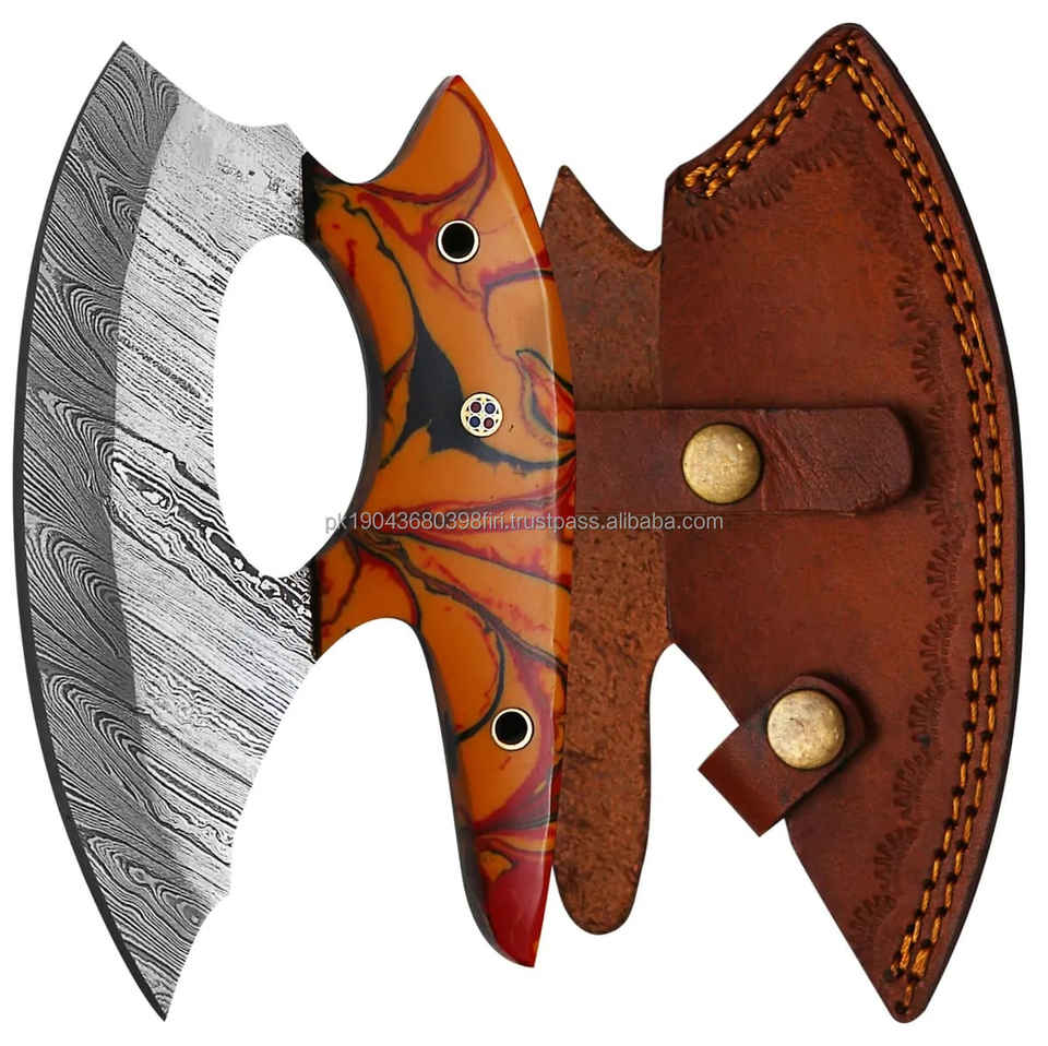 Traditionnel pleine Tang multi-usages damas acier inoxydable coupe-pizza hache viande hacher couteau utilitaire gaine en cuir