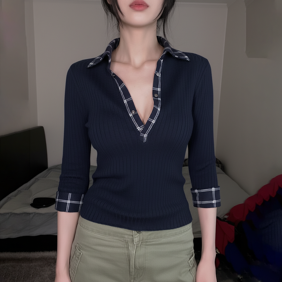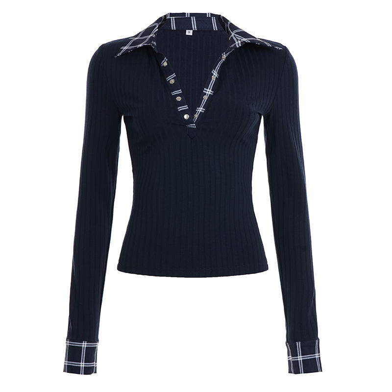 T-shirt en tricot côtelé bleu foncé avec col à carreaux et poignets revers boutonné haut à manches longues décontracté polyvalent 2025