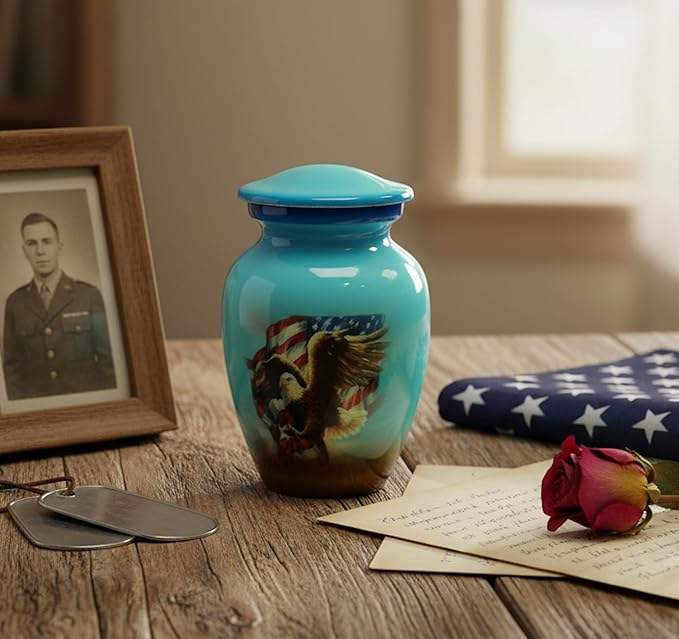 Mini urne funéraire commémorative pour cendres | Petite urne pour cendres | Couleur bleu ciel, drapeau américain Falcon | Taille 4,5 pouces