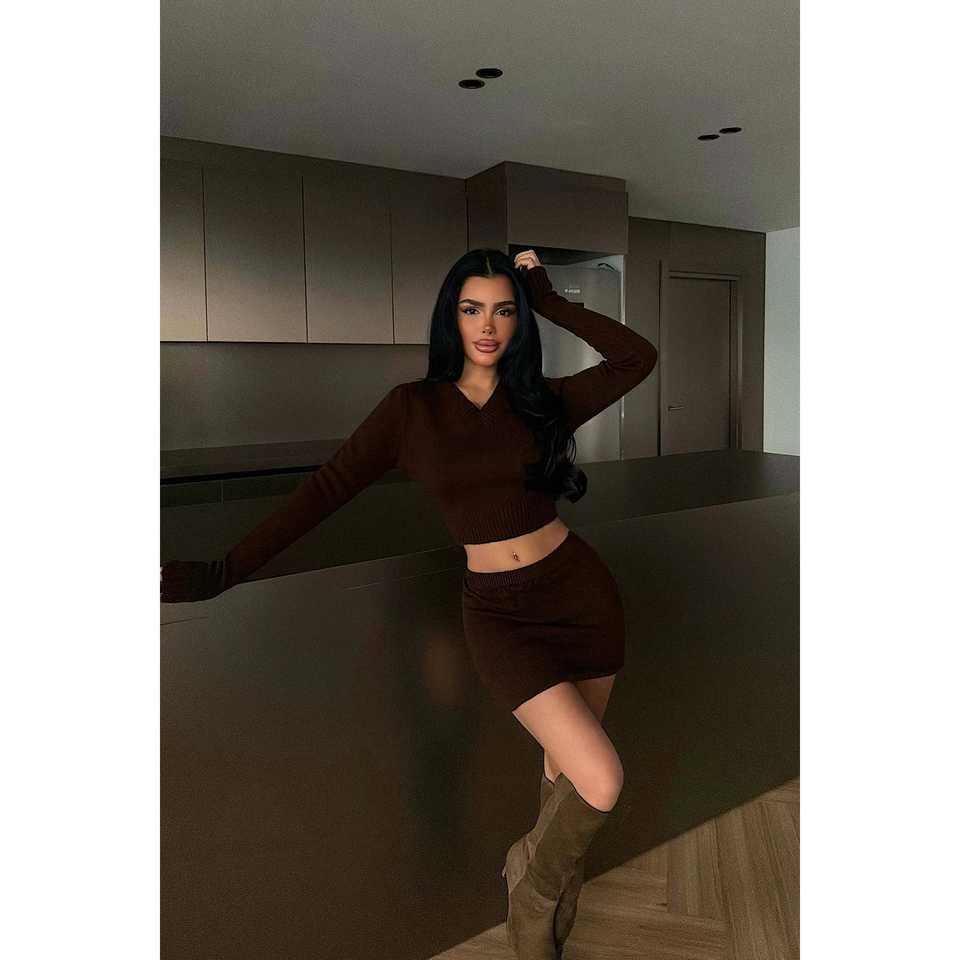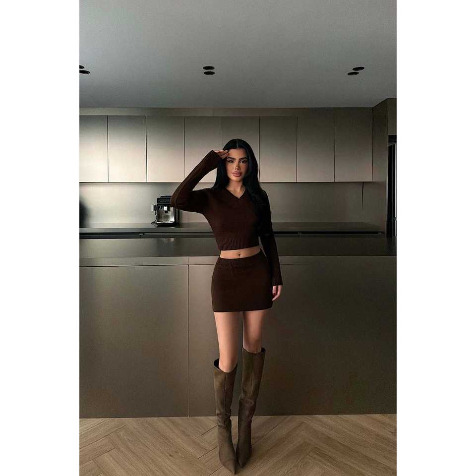 Ensemble jupe asymétrique marron foncé, motif imprimé décontracté, tricoté en tissu laineux, coupe ajustée pour l'été