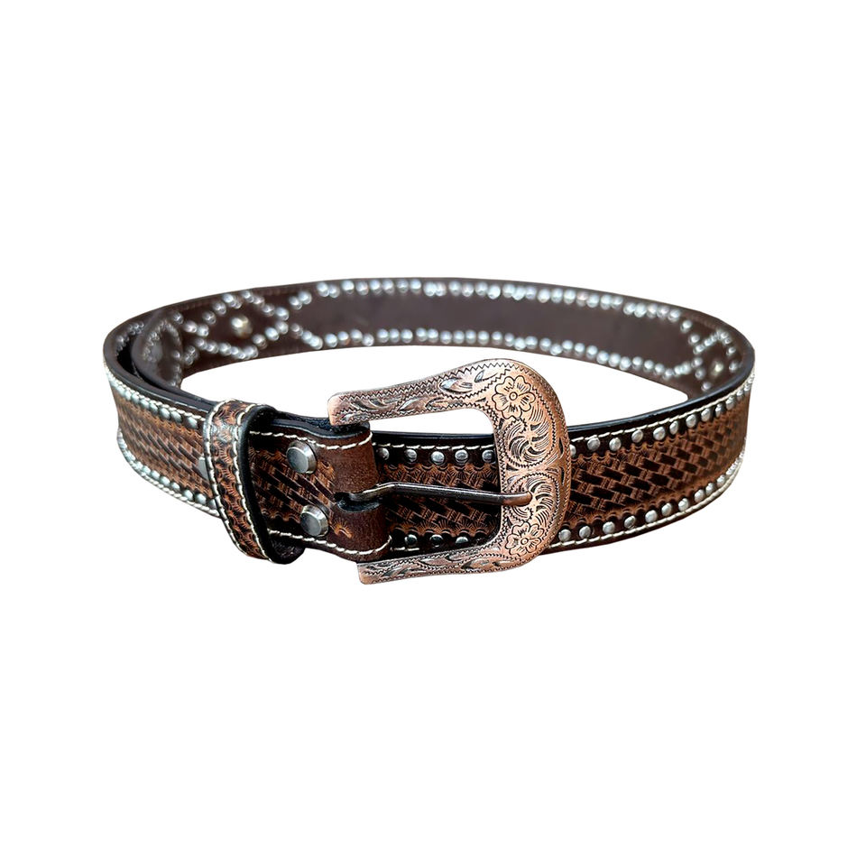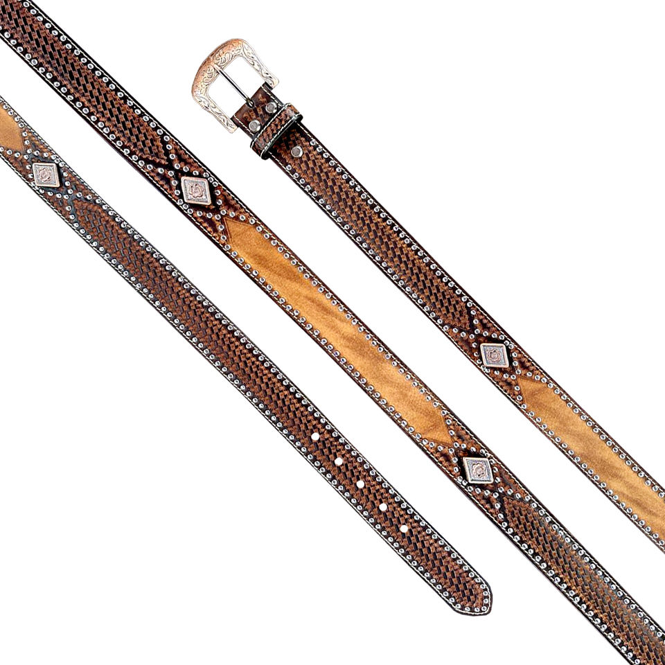 Ceinture en cuir unisexe marron foncé avec clous et concho en diamant, boucle en laiton, finition vintage vieillie, largeur 40 mm, épingle en alliage