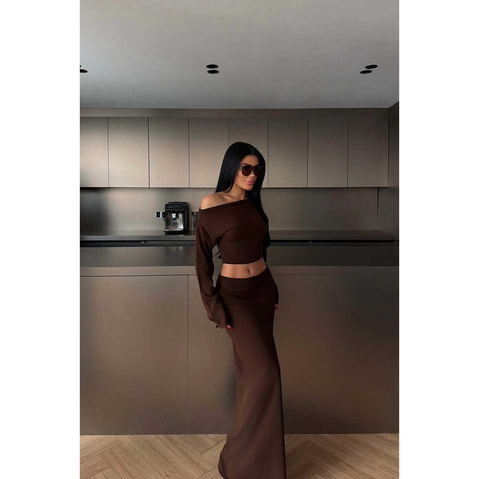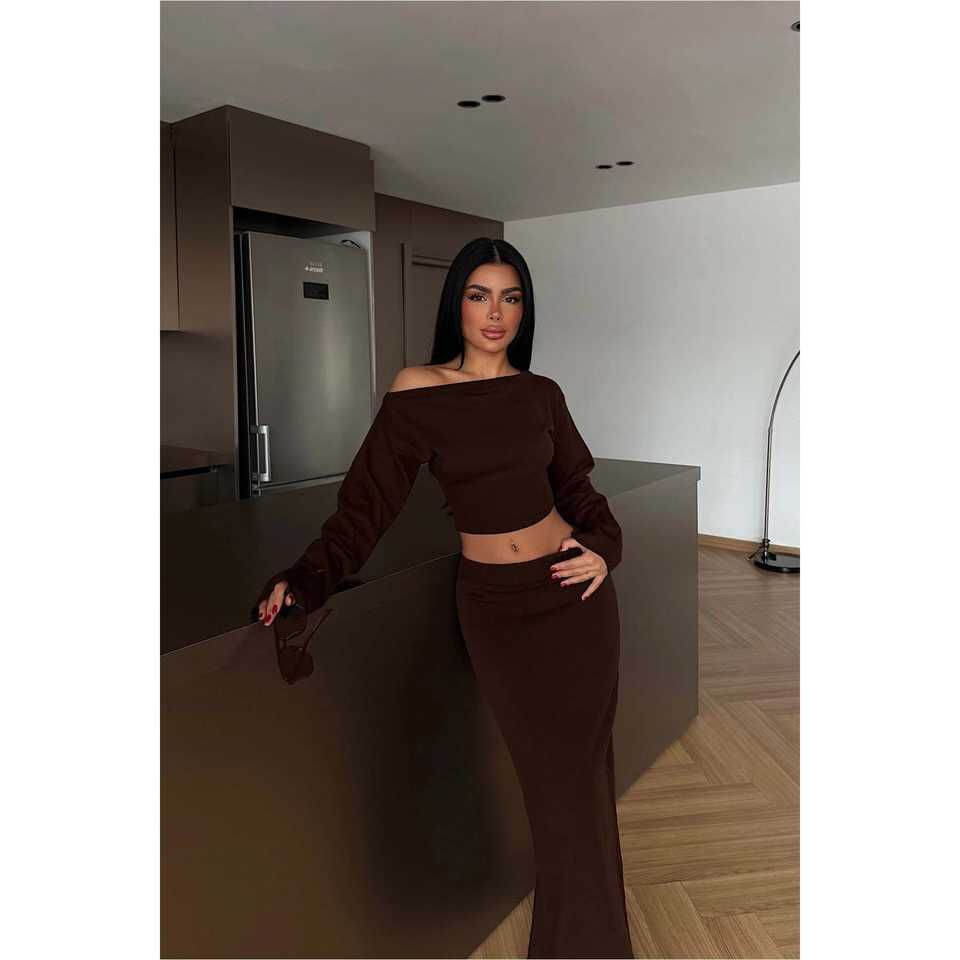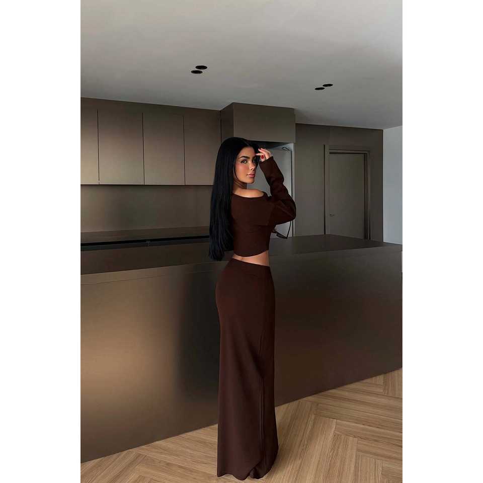 Ensemble jupe et haut à manches longues couleur café foncé avec imprimé unique